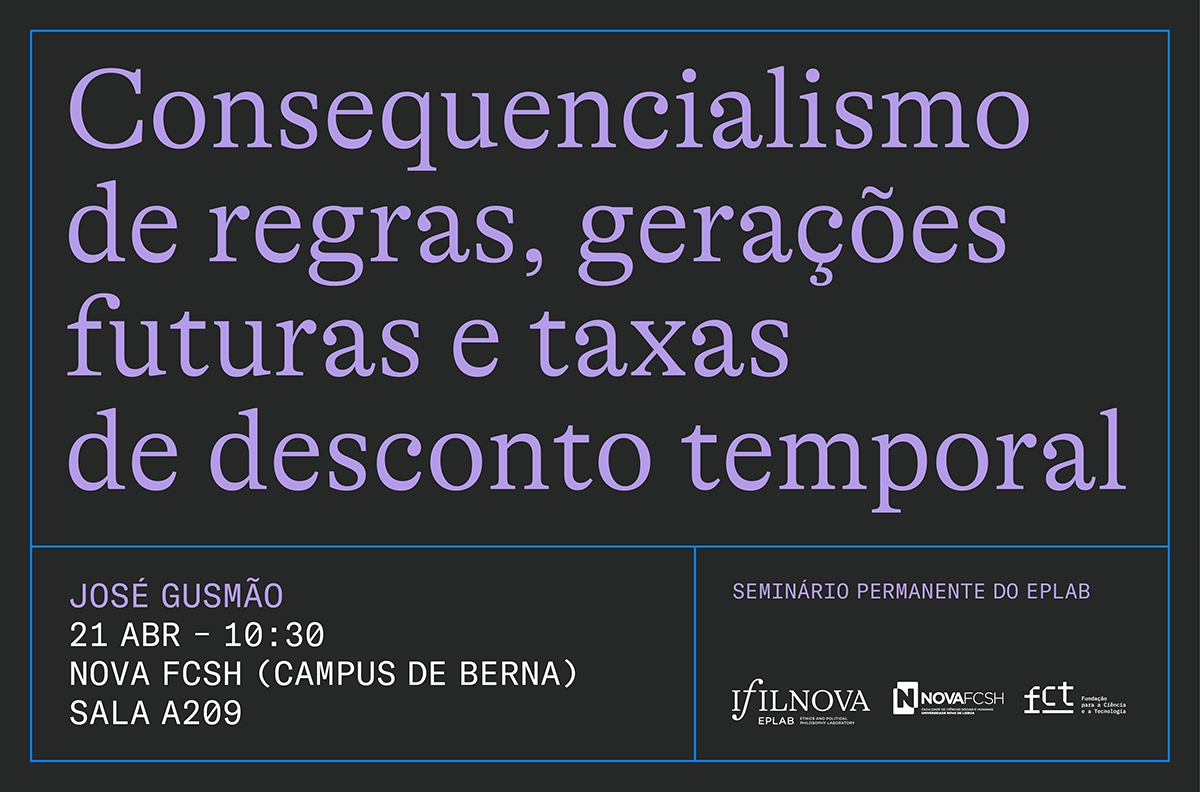 The seventh session of the EPLab Permanent Seminar will be led by José Gusmão (IFILNOVA), who will talk about “Rule consequentialism, future generations and time discount rates”. The session will take place on 21 April, at 10:30, in room A209 at NOVA FCSH (Berna Campus), and will be held in Portuguese.