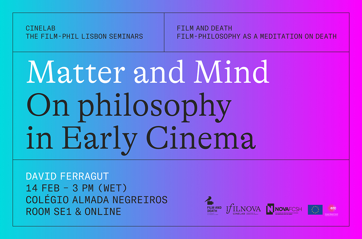 The next Film-Phil Lisbon Seminar (2023-2024) will be led by David Ferragut (Universitat Autònoma de Barcelona, Spain) who will talk about “Matter and Mind. On philosophy in Early Cinema”. The session will be held on February 14, 2024, at 3 PM (Lisbon time) in room SE1 of Colégio Almada Negreiros and online, via Zoom.