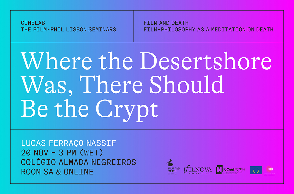 The next Film-Phil Lisbon Seminar will be led by Lucas Ferraço Nassif (IFILNOVA) who will talk about “Where the Desertshore Was, There Should Be the Crypt”. The session is hybrid and will be held on November 20, 2024, at 15:00 PM (Lisbon time), at Colégio Almada Negreiros (room SA) and online, via Zoom. To receive information about joining the meeting online, it’s mandatory to register in advance here.