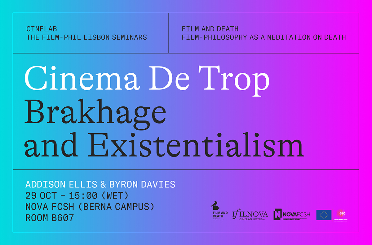 The next Film-Phil Lisbon Seminar will be led by Addison Ellis (American University of Cairo) and Byron Davies (University of Murcia), who will talk about the “Cinema De Trop: Brakhage and Existentialism”. The session will be held exclusively in person on 29 October 2025 at 15:00 WET, in room B607 at NOVA FCSH (Berna Campus).