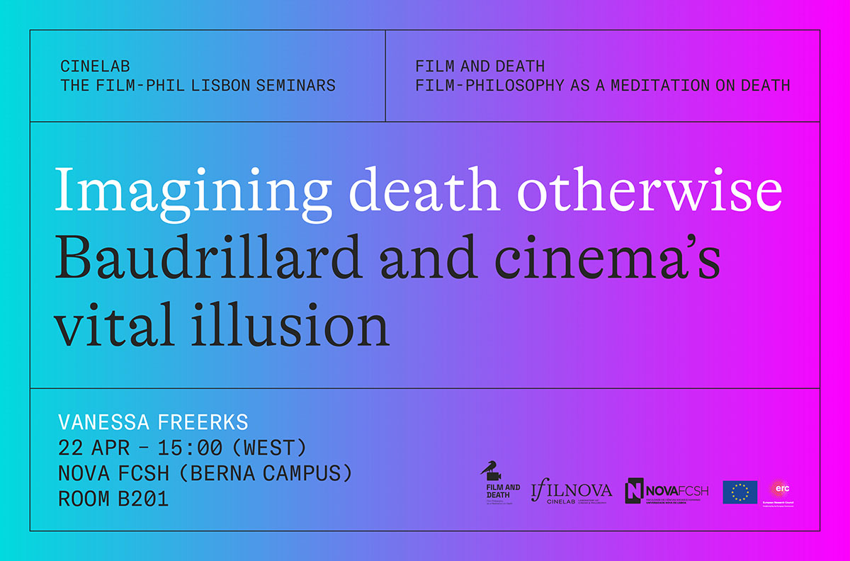 April’s Film-Phil Lisbon Seminar will be led by Vanessa Freerks (University of Fort Hare) who will talk about “Imagining death otherwise: Baudrillard and cinema’s vital illusion”. The session will be held on 22 April 2026, at 15:00 WEST, in room B201 at NOVA FCSH (Av. de Berna, 26 C).