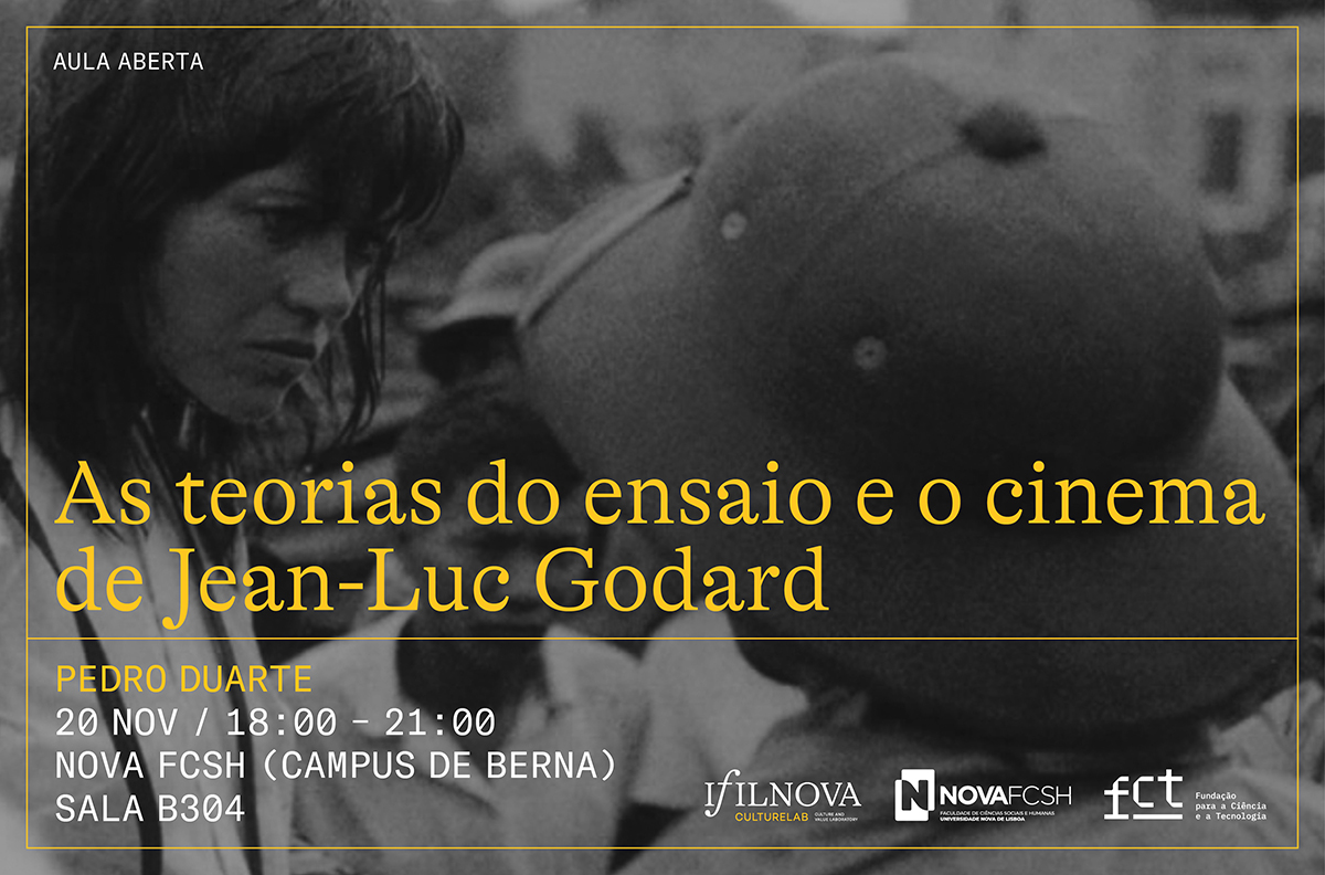 No dia 20 de novembro, o Professor Pedro Duarte (PUC-Rio; Capes-PrInt, CNPq, Faperj) dará uma Aula Aberta sobre “As teorias do ensaio e o cinema de Jean-Luc Godard”. A aula terá lugar na sala B304 da NOVA FCSH (Av. de Berna), entre as 18:00 e as 21:00.