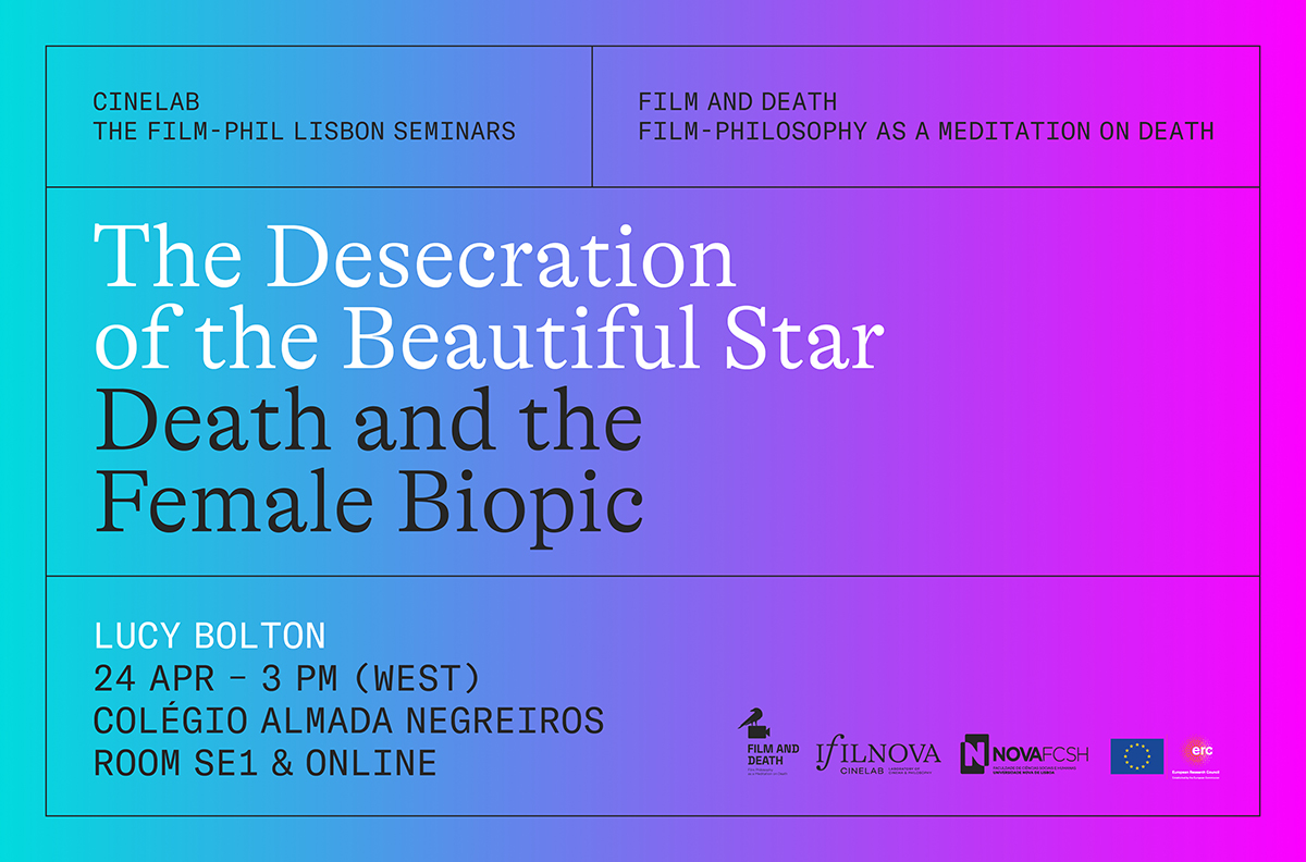 O próximo seminário Film-Phil de Lisboa (2023-2024) estará a cargo de Lucy Bolton (Queen Mary University of London, Reino Unido), que falará sobre “The desecration of the beautiful star: death and the female biopic”. A sessão será em inglês e terá lugar no dia 24 de abril, às 15h00 (hora de Lisboa), na sala SE1 do Colégio Almada Negreiros e online, via Zoom.