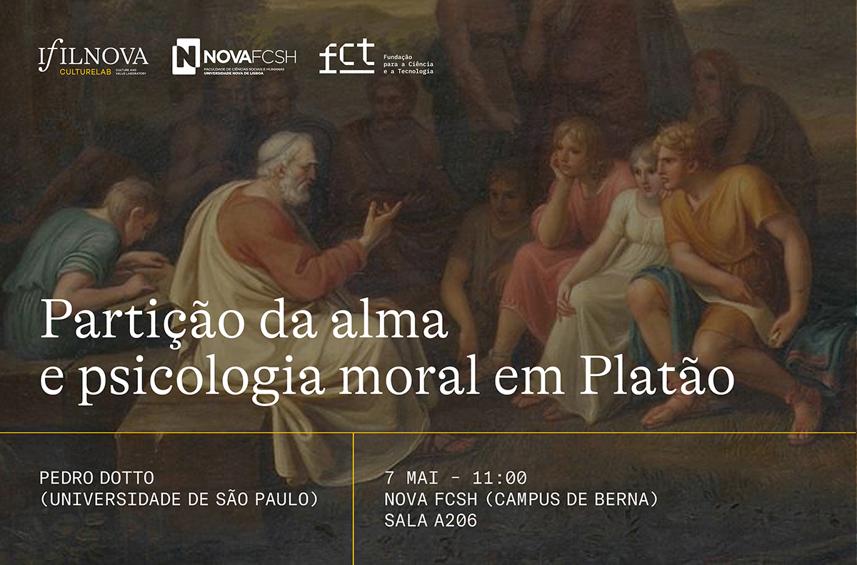 Pedro Dotto (Universidade de São Paulo) dará uma seminário sobre “Partição da alma e psicologia moral em Platão”, no dia 7 de maio de 2026, na sala A206 da NOVA FCSH (Campus de Berna, Torre A), das 11:00 às 13:00.