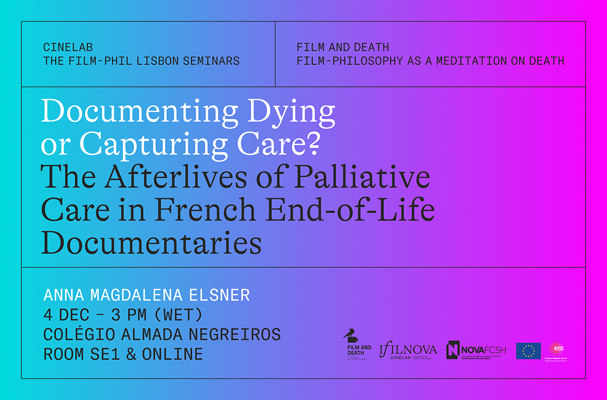 Em dezembro, o seminário Film-Phil de Lisboa (2023-2024) estará a cargo de Anna Magdalena Elsner (Universidade de São Galo, Suíça), que falará sobre “Documenting Dying or Capturing Care? The Afterlives of Palliative Care in French End-of-Life Documentaries”. A sessão será em inglês e terá lugar no dia 4 de dezembro de 2024, às 15h00 (hora de Lisboa), na sala SE1 do Colégio Almada Negreiros e online, via Zoom.